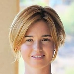 Sweet blonde Jessie Andrews is naked smiling into camera and holding hand between legs